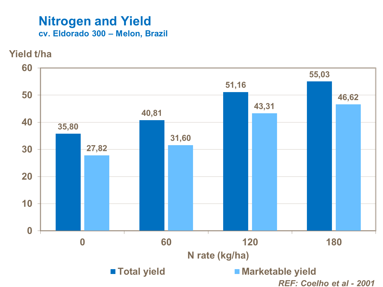 Nitrogen is key for growth and development. It is one of the most important nutrients required for high melon yields. Right amount and timing of nitrogen supply is also important. However, too much nitrogen at flowering can restrict flowering, and therefore fruit set and melon yield. Nitrogen form is particularly important and it is critical to maintain a good balance between ammonium and nitrate forms to maintain fast growth and good crop productivity.