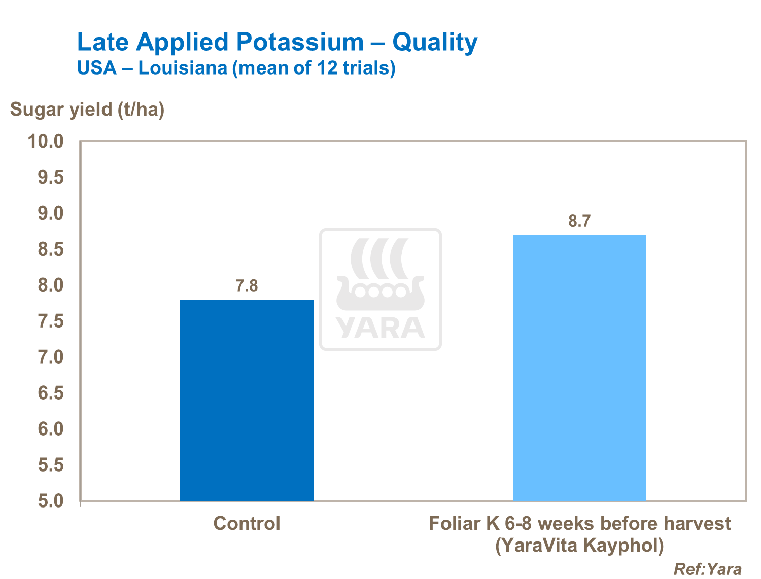Very high levels of potassium can however, reduce sucrose levels. Trials show that foliar potassium applied to the plant 6-8 weeks prior to harvest, reduced cane fiber by 28%.