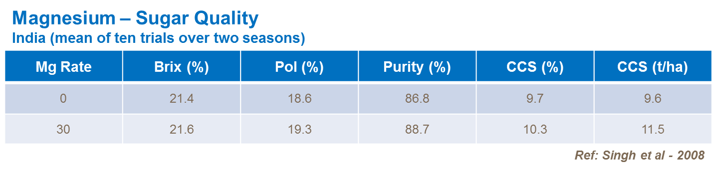 Sugar is also influenced by magnesium supply and sucrose content is reduced where magnesium nutrition is inadequate. It is important to balance the levels of potassium and magnesium, as high levels of potassium can restrict and compete with uptake of magnesium.