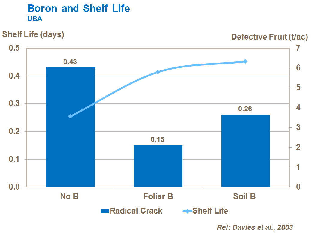 Boron has a positive influence on the level of cracking and shelf life of the tomato fruit. Any cracks on the fruit shoulder increases water loss and susceptibility to pathogen attack. Potassium and Calcium deficiencies also increase the risk of cracking in tomatoes.
