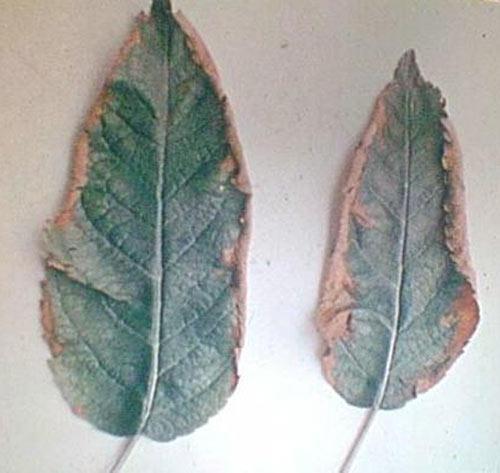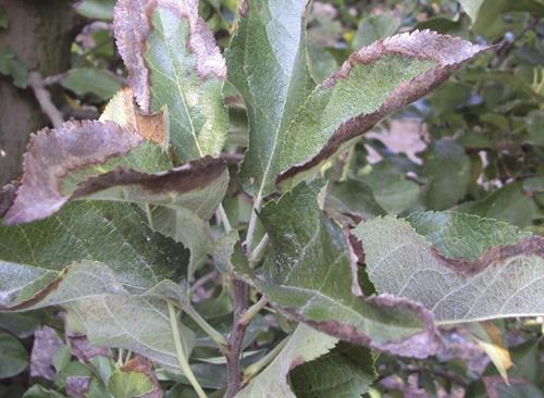 Old leaves bluish-green with scorched margins (brown or grey). Margins may first appear light green and later turn necrotic. Necrosis progresses from the margins inward to the midrib.