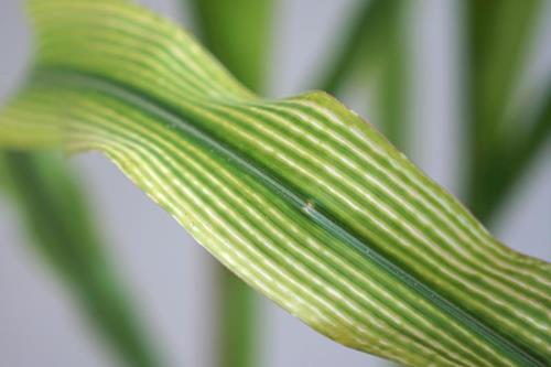 First symptom is interveinal chlorosis at the older leaves. Yellow to white stripes or typical beaded lesions occur; tissue along the main vein stays green for the longest time.