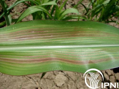 First symptom is interveinal chlorosis at the older leaves. With progressing deficiency the yellow/white stripes show red and purple tints and streaky lesions.