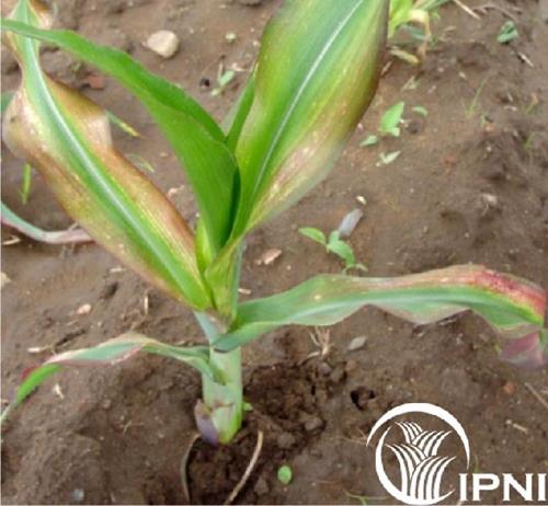 First symptom is interveinal chlorosis at the older leaves. White necrotic spots later develop within these chlorotic zones which coalesce to necrotic stripes between the veins. With progressing deficiency the tips and edges may die off. Growth of plant is normal, unless deficiency is severe.