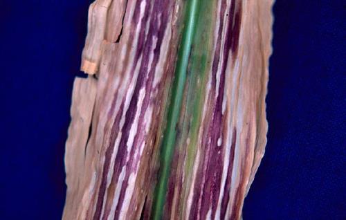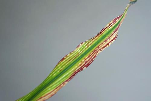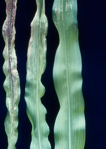 Severely affected leaf (left) shows red and purple tints with interveinal streaky lesions. Whilst mildly affected leaf (centre and right) shows interveinal chlorosis and streaky lesions only.
