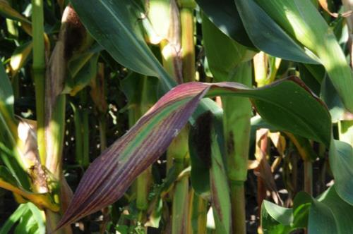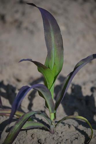 Some maize hybrids show reddish leaves in younger development stages although P supply is sufficient.