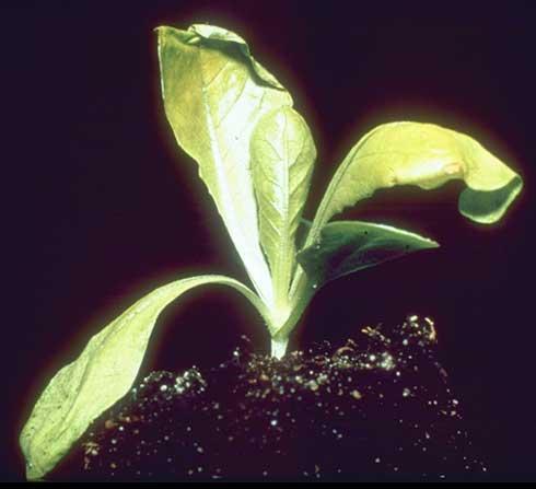 Growth of the plant is clearly inhibited, and the plants turn pale green. The leaves start wilting from the leaf tips and margins, the tissue dies off afterwards and shows a brown/yellow colour.
