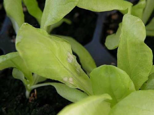 The plant turns pale green, and transparent spots appear in the intercostal areas of the leaves. These become necrotic later and coalesce to bigger necrotic zones. This symptom may also appear on older plants.