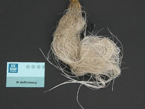 Plants with nitrogen deficiency develop very long main roots and less secondary roots than normal.