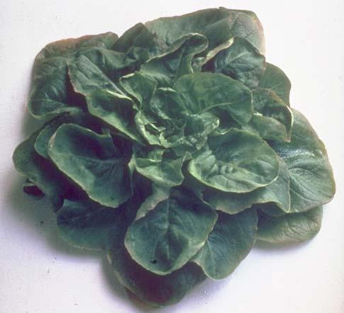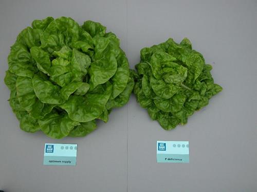 Symptoms may be confused with excessive nitrogen supply. Excess nitrogen leads also to dark green lettuce plants, but in this case the leaves are more rounded and the underside of the leaves does not turn purple.