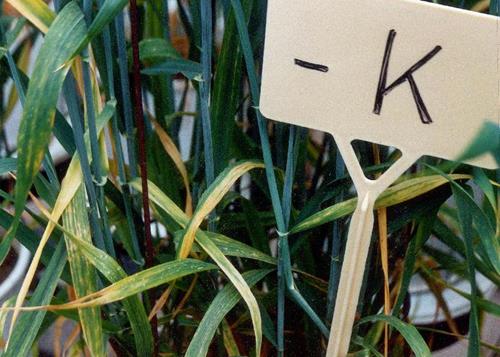 Potassium deficiency results in a characteristic pattern of leaf discoloration by small whitish-yellow spots, followed by scorching or browning of the leaf edge of lower, older leaves. Intercostal chlorosis occurs toward the leaf base.