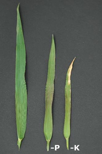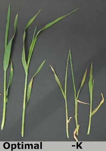 Scorching or browning of the leaf tip and edge of older leaves is characteristic for K deficiency. Starting from the leaf tip, the bottom leaves desiccate prematurely.