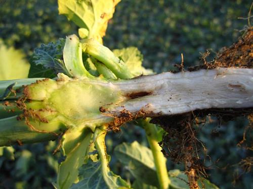 Shortened internodes of the shoot lead to a stunted appearance. Splits and hollow lesions occur in stems and truncs.