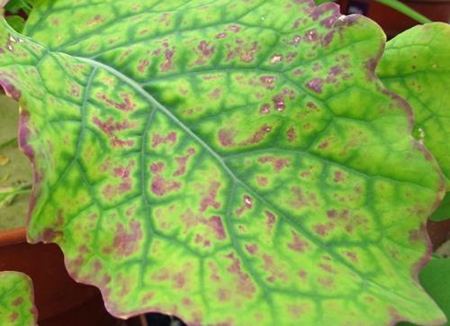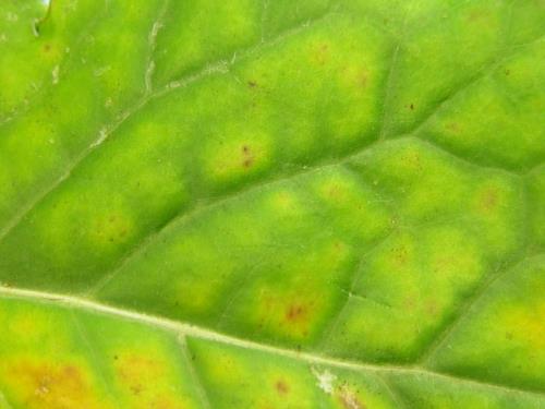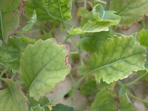 Chlorosis develops between the veins, while a narrow area on each side of the veins remains green. The leaf margins - and with proceeding deficiency also the intercostal areas - become necrotic. The discoloration of the leaves can vary from chlorotic-yellow to purple/brown.