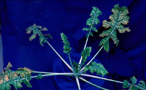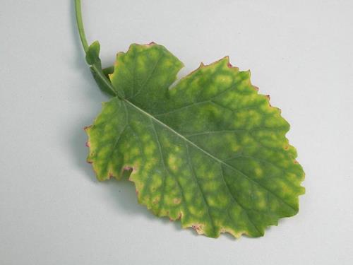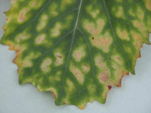 Magnesium deficiency always shows initially on the older leaves. Chlorosis develops between the veins, while a narrow area on each side of the veins remains green. The leaf margins - and with proceeding deficiency also the intercostal areas - become necrotic.