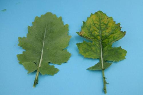 Magnesium deficiency always shows initially on the older leaves. Chlorosis develops between the veins. A narrow area on each side of the veins remains green. Later on, the leaf margins and intercostal, chlorotic areas become necrotic.