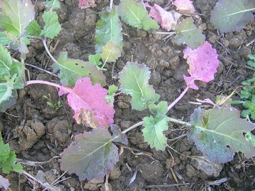 The purple leaf color is similar to the discoloration caused by P, Mg, B or S deficiency.
