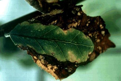 In severe instances, leaf margins become necrotic, curl up, and leaves die and drop prematurely. Only a few tufted leaves remain at the tip of the branches.