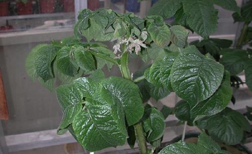 The complete plant shows paling and yellowing. Young leaves are thickened, crinkled and cupped upward.