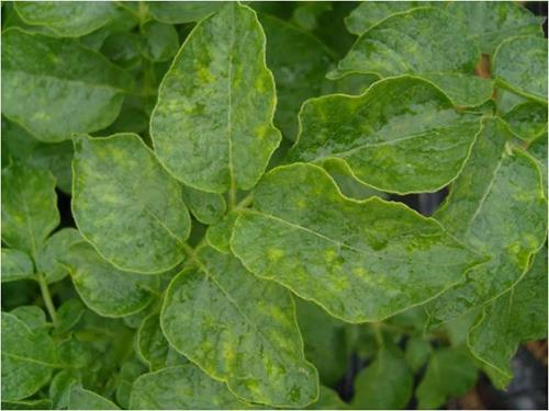 Symptoms begin with yellowing in intercostal areas at the base of leaflets or leaf margin. The chlorosis expand to the whole leaf as the deficiency continues. The margin often remains green.