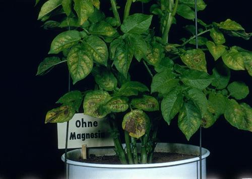 Symptoms begin with yellowing in intercostal areas at the base of leaflets or leaf margin of older leaves. The chlorosis expand to the whole leaf as the deficiency continues. The margin often remains green.