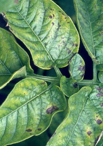 Symptoms are most severe in the oldest leaves, which have green veins and large areas of marginal and intercostal necrosis.