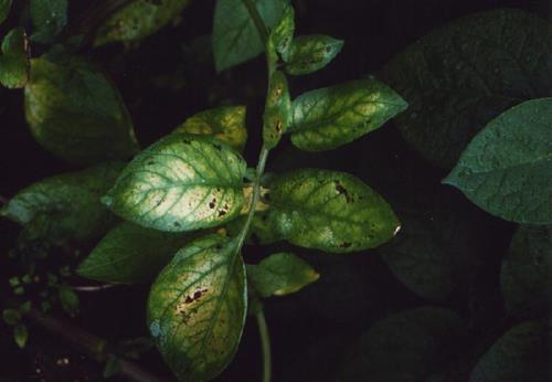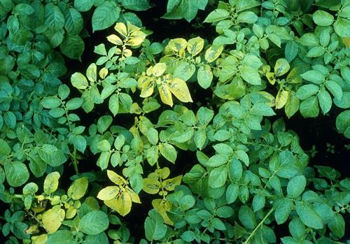 Manganese deficiency is similar but here intercostal yellowing starts on younger leaves and the necrosis is usually in spots along the line of the veins.