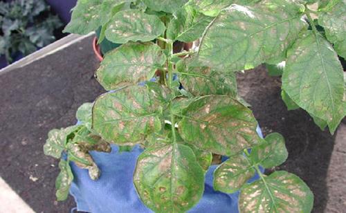 Eventually necrotic patches appear in the yellow areas which terminate as intercostal leaf scorch.