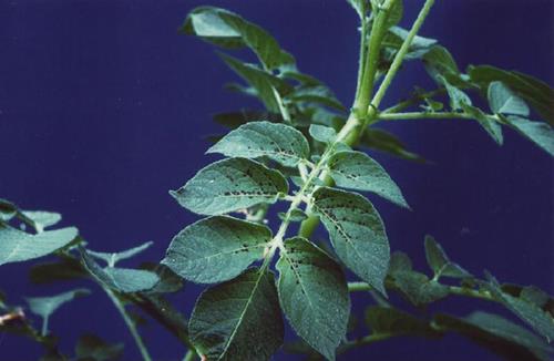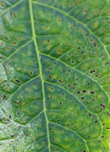 Symptoms start on younger leaves. Leaves turn pale green/yellow followed by black spots developing along the line of the veins.