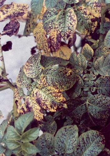 Symptoms start on younger leaves. Leaf veins first remain green, but black spots develop along the line of the veins. Slight cupping of entire leaflets. Leaves near shoot tip small and chlorotic/necrotic.