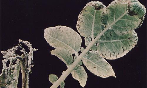 Could be confused with late blight (Phytophthera infestans) but manganese deficiency has no smell and necrosis of stem base.