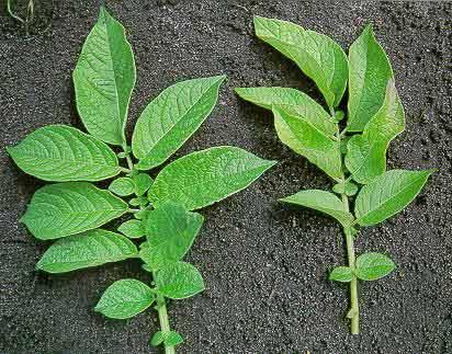Plants (right) are stunted and leaves show a uniform chlorotic pale green / yellow colouration