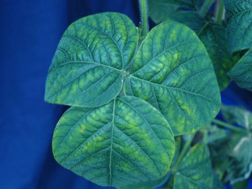Interveinal chlorosis on younger leaves due to calcium deficiency.