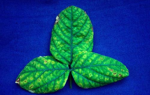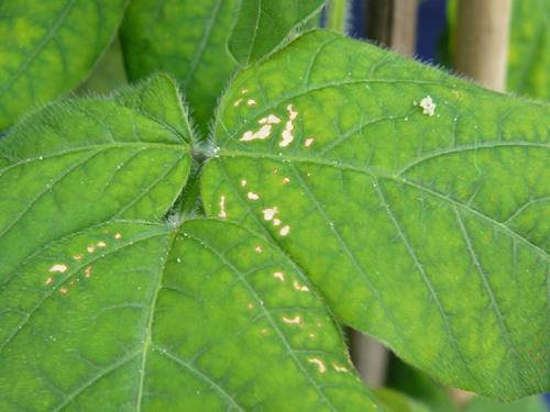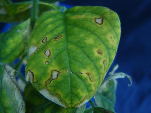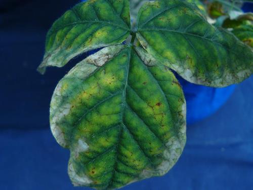 Whitish to light brown necrotic blotches occur on the interveinal, marginal areas.