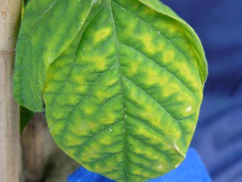 Mg deficiency symptoms are light green to yellow chloroses of interveinal tissues. Leaf margins are bent down. The older, lower leaves are affected first.
