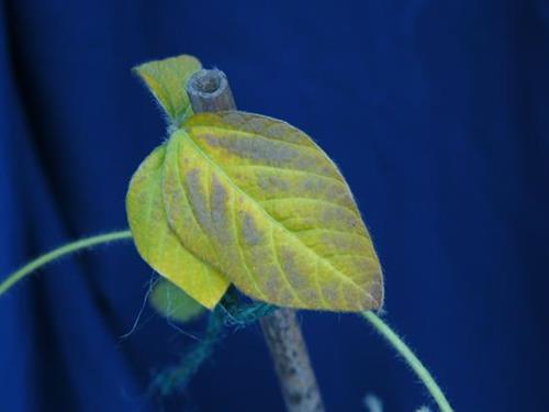 Plants suffering from P deficiency usually show a dark green to bluish tint on their foliage. In the displayed picture, leaves show an even chlorosis and a dark, brownish tint on the interveinal fields.