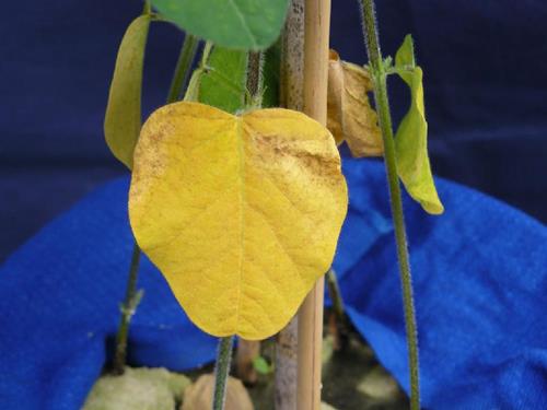 In the displayed picture, leaves show an even yellow chlorosis and a beginning light brown necrosis on the marginal area of the leaf base.