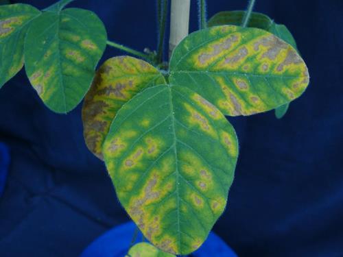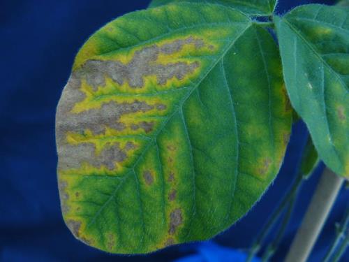 Light brown necrotic blotches coalesce towards the leaf margin.