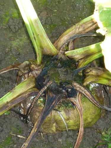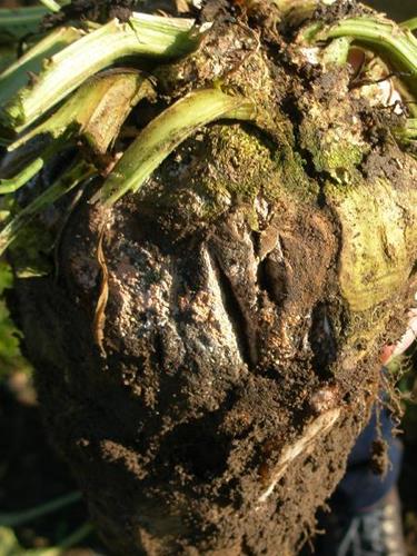 The beet shows a deeply ridged and rotten surface. Necrosis of the beet top is common with Boron deficiency.