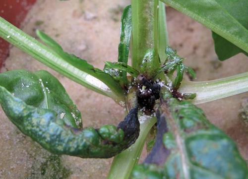 The symptoms start on younger leaves which get crinkled and brittle and remain small. Later they get twisted and black or brown corky spots appear on the petioles. The younger leaves show wilting symptoms and become subsequently black and dry. The older ones show wilting symptoms with chlorosis between the leaf veins.