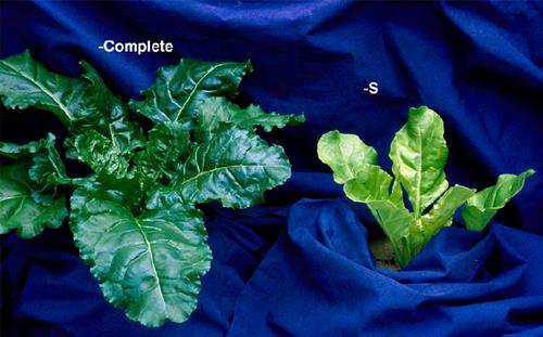 Early symptoms of S deficiency may be confused with those of N deficiency. In both cases, leaves fade gradually from green to a light yellow-green. Later on, the heart leaves of S deficient plants become light green to almost yellow in contrast to the deep green with N deficiency.
