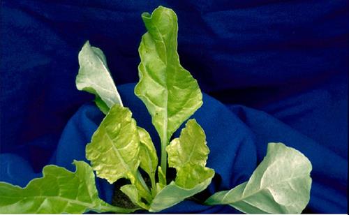 Growth is stunted, and the plants have a stiff upright appearance. Leaves and petioles can become brittle.